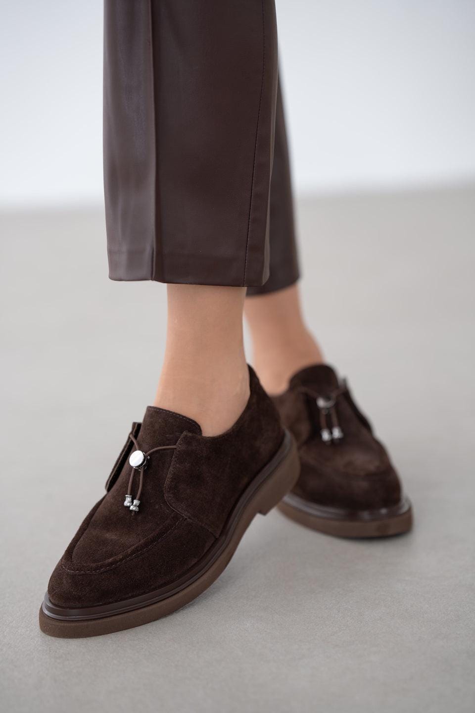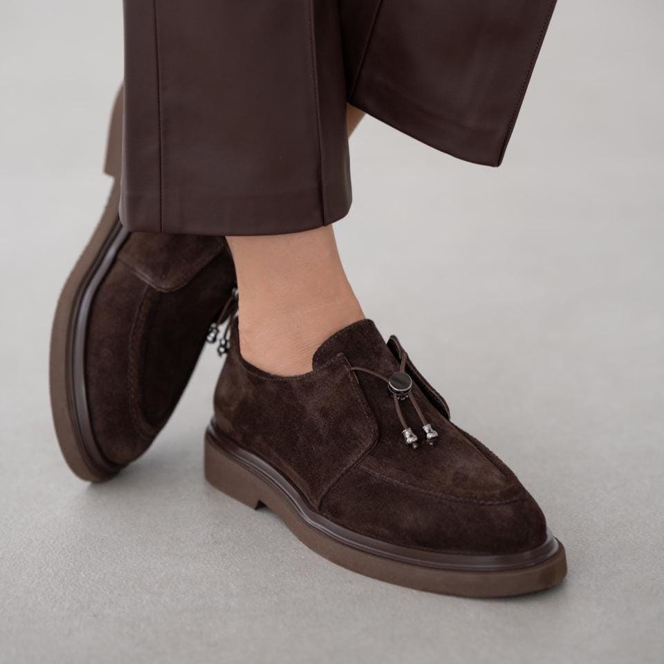Elevate your everyday style with these Genuine Suede Leather Loafers for Women — a perfect mix of timeless craftsmanship, comfort, and elegance. Made from premium brown suede, these loafers feature a unique lace-up and accessory detail, adding a modern twist to the classic loafer silhouette.