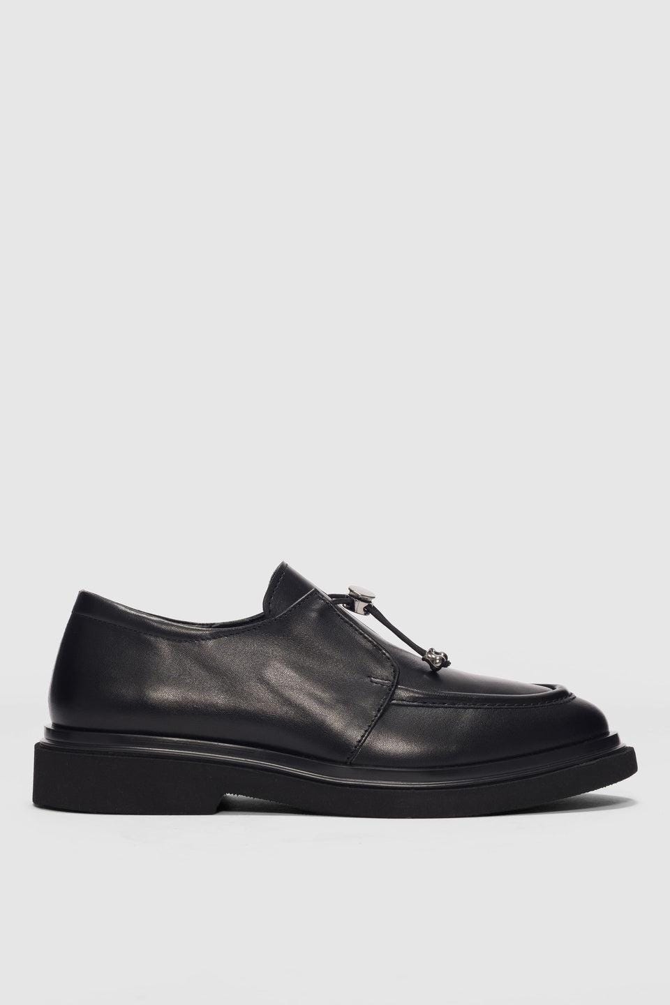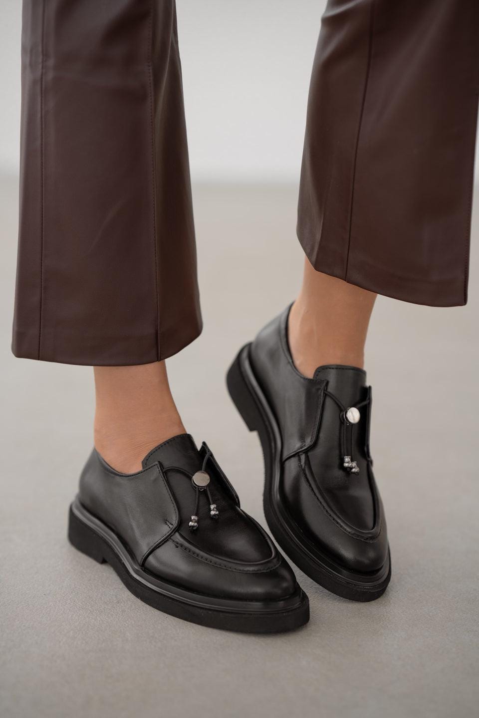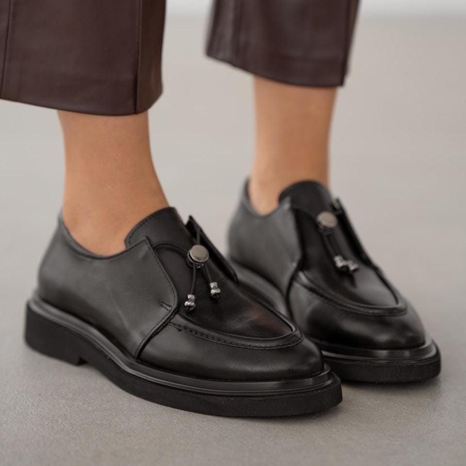 Step into timeless sophistication with these Genuine Black Leather Loafers for Women. Crafted from premium quality leather, these shoes combine a classic loafer silhouette with modern touches like adjustable laces and chic accessory detailing.