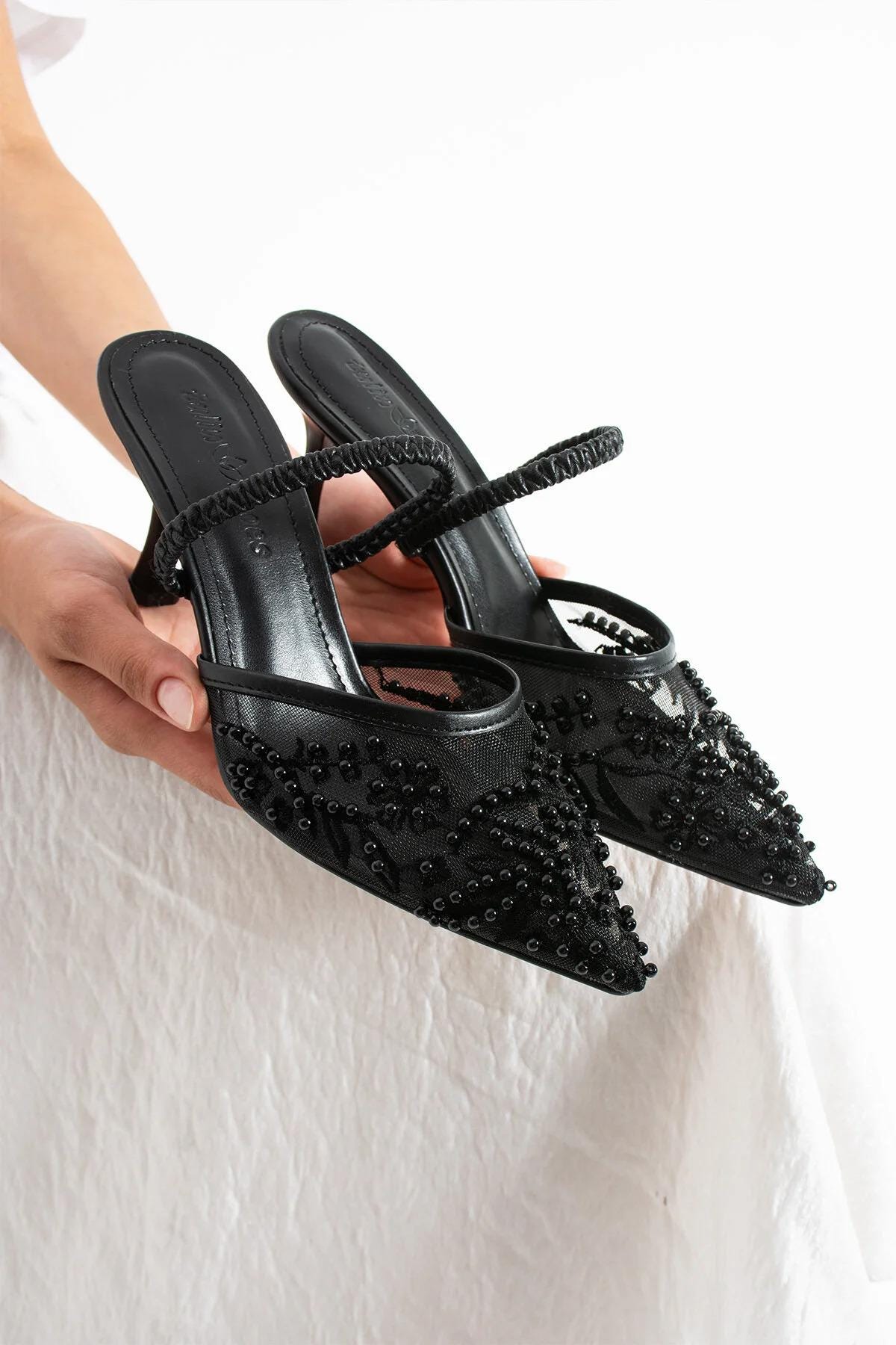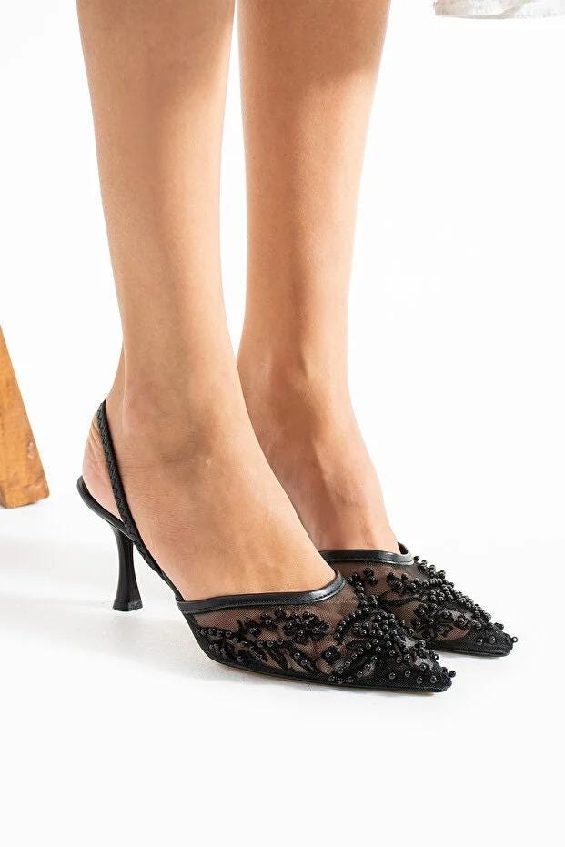 Women Beaded Embroidered High Heel Bridal Wedding Shoes Elegant Black Detailed Bride Heels