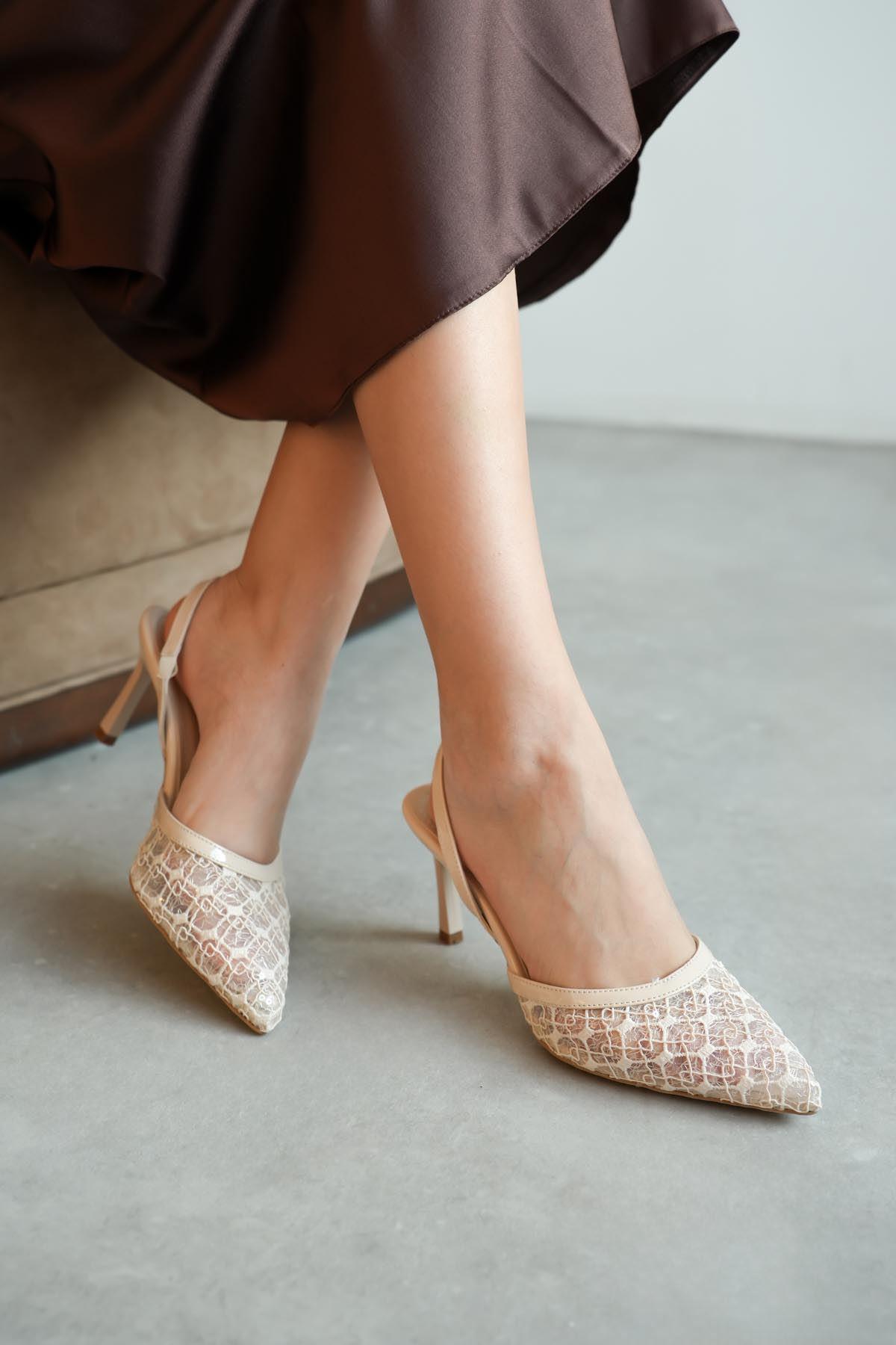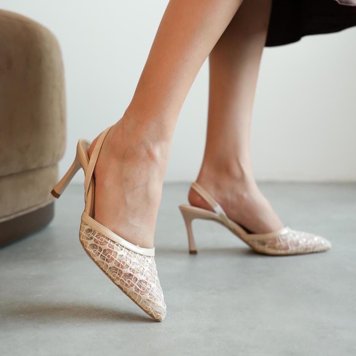 Beige Lace Bridal Heels – Elegant Pointed Toe Wedding Pumps