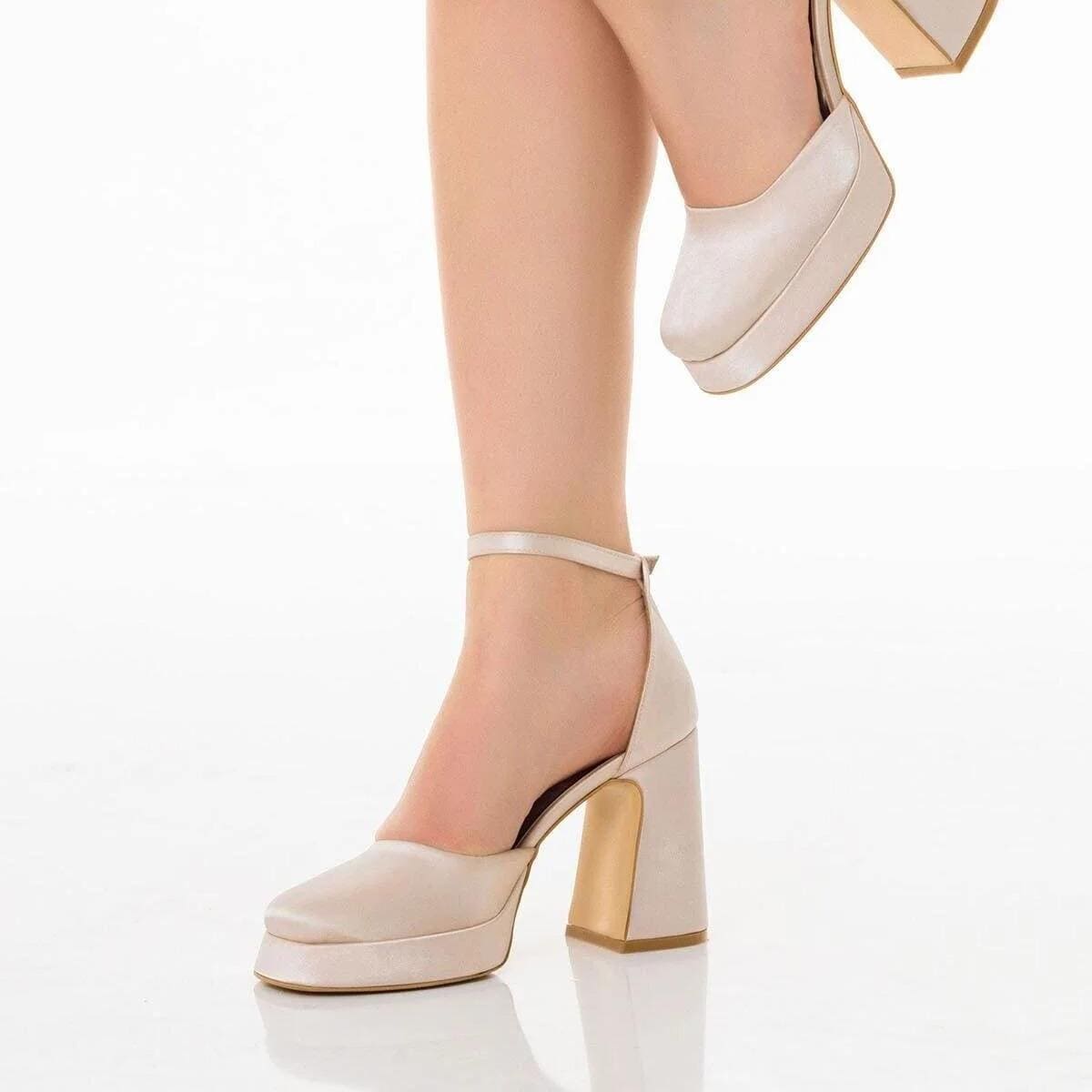 Crafted from luxurious satin fabric in a beautiful beige tone, these platform heels offer extra support and stability while enhancing your silhouette. The ankle strap design provides a secure and elegant fit, making them perfect for long wedding days and unforgettable celebrations.