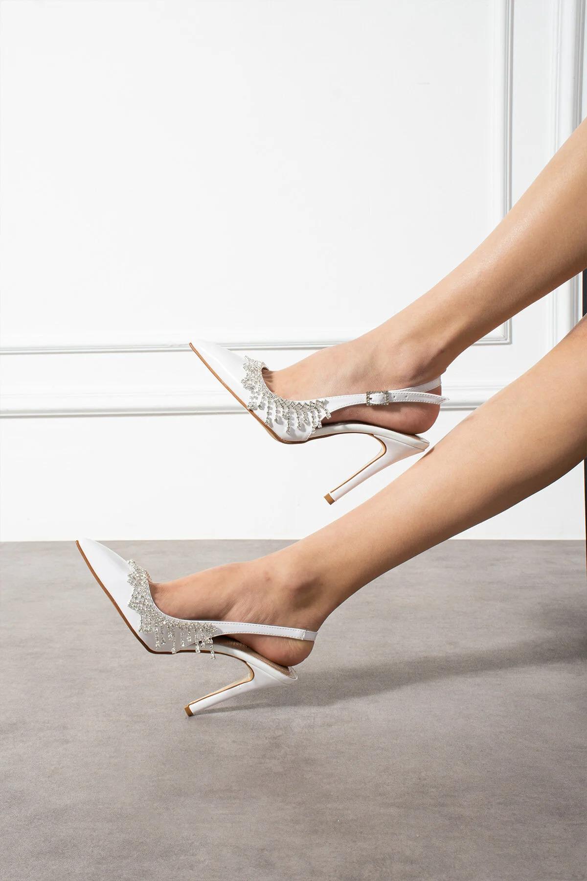Crystal Fringe Bridal Heels, White Pointed Toe Stiletto, Wedding Slingback